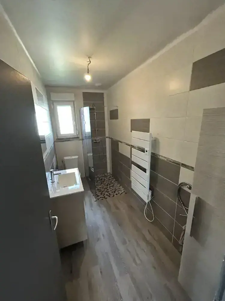 Sur Sarralbe maison individuelle offrant : entrée, salon séjour, cuisine équipée, 2 chambres, wc, sdb.