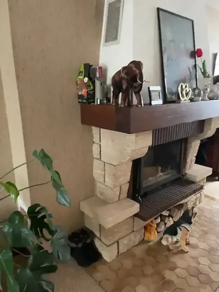 Entrée, vaste salon séjour avec cheminée, cuisine équipée accés jardin clos d'un mur en pierres, wc, céliier, garage.